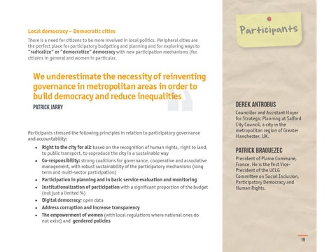 to public transport, to coproduce the city in a sustainable way Co-responsibility: strong coalitions for governance, cooperative and associative management, with robust sustainability of the participatory mechanisms (long term and multi-sector participation) Participation in planning and in basic service evaluation and monitoring Institutionalization of participation with a significant proportion of the budget (not just a limited %) Digital democracy; open data Address corruption and increase transparency The empowerment of women (with local regulations where national ones do not exist) and gendered policies