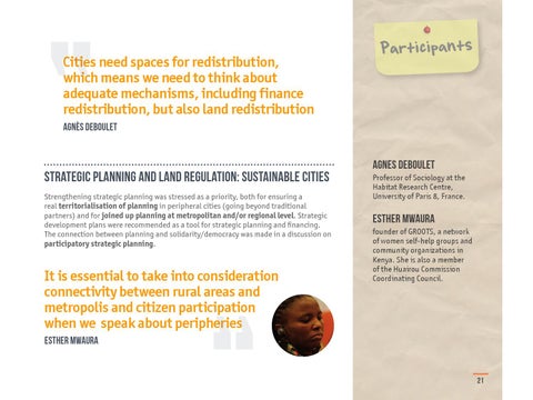 Strategic planning and land regulation: sustainable cities Strengthening strategic planning was stressed as a priority, both for ensuring a real territorialisation of planning in peripheral cities (going beyond traditional partners) and for joined up planning at metropolitan and/or regional level. Strategic development plans were recommended as a tool for strategic planning and financing. The connection between planning and solidarity/democracy was made in a discussion on participatory strategic planning.