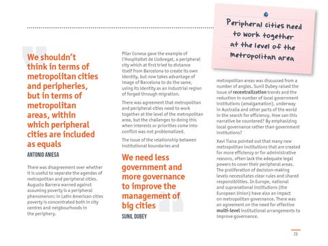 There was disagreement over whether it is useful to separate the agendas of metropolitan and peripheral cities. Augusto Barrera warned against assuming poverty is a peripheral phenomenon; in Latin American cities poverty is concentrated both in city centres and neigbourhoods in the periphery.