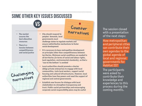 The session closed with a presentation of the next steps: How metropolitan and peripheral cities can contribute their own agendas to the global agenda of local and regional governments for Habitat III? The participants were asked to contribute their knowledge and experiences to this process during the coming months. 31