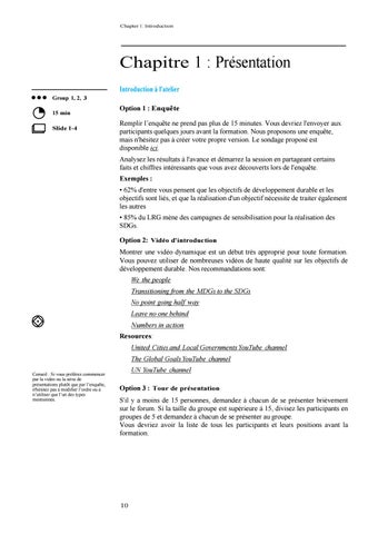 Option 1 : Enquête Remplir l’enquête ne prend pas plus de 15 minutes. Vous devriez l'envoyer aux participants quelques jours avant la formation. Nous proposons une enquête, mais n'hésitez pas à créer votre propre version. Le sondage proposé est disponible ici. Analysez les résultats à l'avance et démarrez la session en partageant certains faits et chiffres intéressants que vous avez découverts lors de l'enquête. Exemples : • 62% d'entre vous pensent que les objectifs de développement durable et les objectifs sont liés, et que la réalisation d'un objectif nécessite de traiter également les autres • 85% du LRG mène des campagnes de sensibilisation pour la réalisation des SDGs. Option 2: Vidéo d'introduction Montrer une vidéo dynamique est un début très approprié pour toute formation. Vous pouvez utiliser de nombreuses vidéos de haute qualité sur les objectifs de développement durable. Nos recommandations sont: We the people Transitioning from the MDGs to the SDGs No point going half way Leave no one behind Numbers in action Resources: United Cities and Local Governments YouTube channel The Global Goals YouTube channel