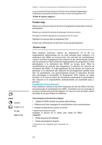 Dernière étape Pour terminer l'exercice, utilisez les diapositives 25 et 26. La responsabilité démocratique est un outil puissant pour conduire à la réalisation des SDGs au niveau local. Les activités de sensibilisation visent à accroître l'engagement des citoyens et des communautés locales afin de promouvoir leur sentiment d'appropriation du programme et leur participation à la réalisation des SDGS au niveau local. Mais la sensibilisation ne consiste pas uniquement à informer les citoyens de l'existence des SDGs. Il s’agit également de leur donner les moyens de participer à la réalisation des objectifs de développement durable dans leur vie quotidienne. Les gouvernements locaux et régionaux doivent être encouragés à reconnaître le Programme 2030 comme un cadre d’action, et la mise en place de mécanismes permettant la participation des citoyens et la responsabilité institutionnelle est essentielle pour y parvenir.