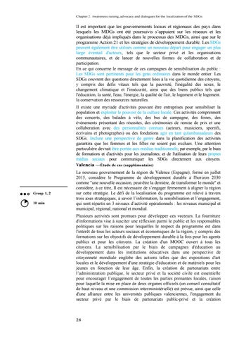 Le nouveau gouvernement de la région de Valence (Espagne), formé en juillet 2015, considère le Programme de développement durable à l'horizon 2030 comme "une nouvelle occasion, peut-être la dernière, de transformer le monde" et considère, à ce titre, Il est nécessaire de s’engager fermement à aligner la région sur cette stratégie. Le défi de la localisation du programme est relevé à travers trois axes stratégiques, à savoir l’information, la sensibilisation et l’engagement, qui sont répartis en 3 niveaux d’activité opérationnels : les niveaux municipal et municipal, régional, national et mondial. Plusieurs activités sont promues pour développer ces vecteurs. La fourniture d'informations vise à susciter une réflexion parmi le public et les responsables politiques sur les raisons pour lesquelles le respect du programme est dans l'intérêt de tous les acteurs sociaux et économiques de la région, y compris des formations sur les objectifs de développement durable à la fois pour les agents publics et pour les citoyens. La création d'un MOOC ouvert à tous les citoyens. La sensibilisation par le biais de campagnes d'éducation au développement dans les institutions éducatives dans une perspective de citoyenneté mondiale englobe des actions telles que des expositions d'art locales et le développement d'une stratégie d'éducation et de matériels pour les jeunes en fonction de leur âge. Enfin, la création de partenariats entre l’administration publique, le secteur privé et la société civile est essentielle pour encourager l’engagement de toutes les parties prenantes locales, raison pour laquelle la mise en place de deux organes officiels (un conseil consultatif de haut niveau et une commission interministérielle) est prévue, ainsi que celle d'une alliance entre les universités publiques valenciennes, l'engagement du secteur privé par le biais de partenariats public-privé et la création