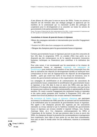 Associations et réseaux de pouvoirs locaux et régionaux •Mener des campagnes nationales et internationales pour accroître l'engagement des LRGs • Soutenir les LRGs dans leurs campagnes de sensibilisation • Désigner des champions parmi les gouvernements locaux et régionaux Certains gouvernements locaux et régionaux peuvent ne pas être conscients de leur rôle dans le programme 2030, ou craindre d'être trop petits ou ne disposent pas des connaissances ou de la capacité nécessaires (ressources humaines, techniques ou financières) pour contribuer à la réalisation des SDGs. Pour cette raison, il est recommandé que les associations et les réseaux de gouvernements locaux et régionaux organisent des campagnes de sensibilisation pour mobiliser leurs membres et leur faire comprendre leur rôle dans la réalisation des objectifs de développement durable en renforçant leurs connaissances et leur sens de l'appropriation des objectifs de développement durable. , quels que soient leur taille et leur niveau de ressources, avec le soutien des gouvernements nationaux et des organisations internationales. Les campagnes de sensibilisation et de communication des associations de gouvernements locaux comprennent la sensibilisation des gouvernements locaux et régionaux à leur rôle dans la mise en œuvre des SDGs ainsi que dans la définition et l'évaluation des stratégies nationales et territoriales, ainsi que la prise de mesures pour renforcer la capacités institutionnelles et opérationnelles de leurs membres. Ils visent à susciter l'engagement des institutions locales et régionales et des autres parties prenantes pour localiser le Programme 2030, ainsi qu'à soutenir leur travail de plaidoyer aux niveaux national et international. La nomination de leaders locaux et régionaux champions qui participent activement à la réalisation des SDGs peut être un puissant outil de sensibilisation et de mobilisation pour les associations de gouvernements locaux et régionaux. Des appels à des champions peuvent être organisés par des associations nationales au niveau national et par la Taskforce mondiale des gouvernements locaux et régionaux aux niveaux mondial et régional (Afrique, Asie, Europe, Amérique latine, etc.). Ces champions communiqueraient les SDGs et l’importance de les localiser. En tant que pionniers dans la mise en œuvre des SDGs, les champions feraient la promotion des recommandations et partageraient leurs expériences, leurs idées et leurs points de vue dans leurs communautés, leurs pays et dans le monde entier lors de conférences, réunions et événements publics. Group 3 (LRGA) 10 min