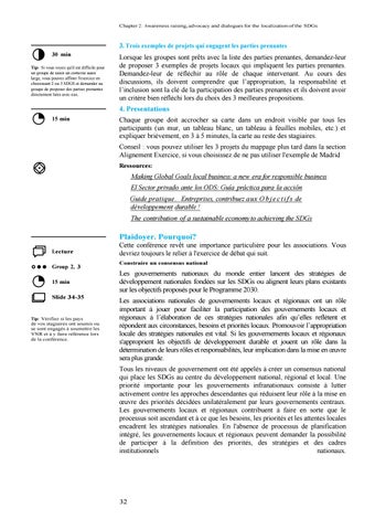 3. Trois exemples de projets qui engagent les parties prenantes 30 min Tip: Si vous voyez qu'il est difficile pour un groupe de saisir un contexte aussi large, vous pouvez affiner l'exercice en choisissant 2 ou 3 SDGS et demander au groupe de proposer des parties prenantes directement liées avec eux.