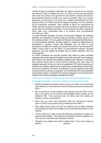 intérêts devant les politiques nationales de manière directe (c'est-à-dire par eux-mêmes)? Dans la plupart des pays, les LRGs ont créé des associations afin d'unir leurs forces et de promouvoir des intérêts communs devant leur gouvernement national. En effet, mis à part les grandes villes et les régions puissantes, les provinces et les États qui comptent généralement sur leurs propres canaux, les LRGs n'ont pas la capacité d'interagir avec les ministères ou les institutions nationales. Pour combler le fossé, les associations de LRGs associent les preuves fournies par leurs membres et s'efforcent de les inclure dans les politiques nationales. Les associations de LRGs s'expriment d'une seule voix, contribuant ainsi à la création d'un environnement favorable aux LRGs. Les gouvernements nationaux devraient se préoccuper d'adopter des politiques publiques qui répondent aux besoins réels des territoires, de leurs citoyens et de leurs parties prenantes. C'est une question d'efficacité et de légitimité démocratique. Les gouvernements nationaux devraient faciliter la création de plates-formes de gouvernance à plusieurs niveaux afin d'interagir avec les LRGs et leurs associations, de définir les intérêts et les besoins du territoire et de coordonner les efforts. Comme dans le cas des LRGs, les gouvernements nationaux devraient également ouvrir des espaces de dialogue avec les parties prenantes actives au niveau national. Les SDGs constituent une nouvelle occasion pour toutes les parties prenantes impliquées dans le développement durable de travailler ensemble et de coordonner leurs actions pour produire des politiques publiques plus efficaces et convenues d'un commun accord, tant au niveau local que national. Pour cette raison, les stratégies nationales de mise en œuvre du programme 2030 devrait répondre aux besoins et aux intérêts exprimés par les territoires par l'intermédiaire de leurs LRGs et de leurs associations. De même, la réalisation du nouvel agenda devrait inciter les gouvernements nationaux à progresser vers l'amélioration de la décentralisation et des régimes fiscaux, la recherche de ressources adéquates au niveau territorial et l'adoption de meilleures politiques nationales territoriales”. Afin de susciter un débat sur l’importance de mener des actions de plaidoyer selon une approche ascendante, les questions suivantes peuvent être posées au public: •