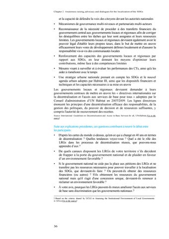 Les gouvernements locaux et régionaux devraient demander à leurs gouvernements centraux de mettre en œuvre les « directives internationales sur la décentralisation et l'accès aux services de base pour tous » adoptées par le Conseil d'administration d’UN Habitat en 2007/2009. Les lignes directrices énoncent les principes d'une décentralisation efficace des responsabilités, de la gestion des politiques, du pouvoir de décision et de ressources suffisantes, y compris l'autorité de recouvrement des recettes. Source: International Guidelines on Decentralization and Access to Basic Services for all, UN-Habitat [Go to the source]