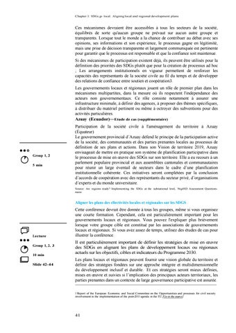 Cette conférence devrait être donnée à tous les groupes, même si vous organisez une courte formation. Cependant, cela est particulièrement important pour les gouvernements locaux et régionaux. Vous pouvez l'expliquer plus brièvement lorsque votre groupe cible est constitué par les associations de gouvernements locaux et régionaux. Si vous avez assez de temps, utilisez des études de cas pour illustrer la conférence. Il est particulièrement important de définir les stratégies de mise en œuvre des SDGs en alignant les plans de développement locaux ou régionaux actuels sur les objectifs, cibles et indicateurs du Programme 2030. Les plans locaux et régionaux peuvent fournir une vision globale du territoire et définir des stratégies fondées sur une approche intégrée et multidimensionnelle du développement inclusif et durable. Et ces stratégies seront mieux définies, mises en œuvre et suivies si l’implication des principaux acteurs territoriaux, les parties prenantes dans un contexte de large gouvernance participative est assurée. 3 Report of the European Economic and Social Committee on the Opportunities and processes for civil society involvement in the implementation of the post-2015 agenda in the EU [Go to the source]