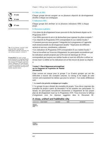 • Les plans de développement locaux peuvent-ils être facilement alignés sur le Programme 2030 ? • Les SDGs peuvent-ils servir de déclencheur pour repenser les plans existants ? • Les objectifs du Programme 2030 correspondent-ils aux réalités locales ? • Comment pouvons-nous garantir l’intégralité de le programme et l’approche multi-dimensionnelle du développement durable ? Implication de différents secteurs et services, coordination, cohérence ... • Les indicateurs du Programme 2030 correspondent-ils aux réalités locales ? Tout en travaillant sur l'exercice d'alignement, les participants reconnaîtront que les indicateurs actuels proposés par la Division de statistique de UN ne correspondent pas toujours aux réalités locales et sont très difficiles à utiliser au niveau local. Le débat sur les indicateurs est un bon moyen de passer au chapitre 4. Version 2 : Plan d'alignement prérempli basé sur les fragments de l'expérience de Madrid (document 8)