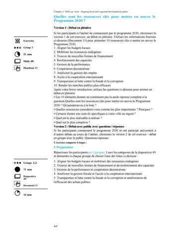 Si les participants à l'atelier ne connaissent pas le programme 2030, choisissez la version 1 de cet exercice, un débat en plénière. Utilisez les informations fournies ci-dessous (Document 11) pour présenter 10 ressources clés à mettre en œuvre le Programme 2030. 1. Aligner les budgets locaux 2. Mobiliser les ressources endogènes 3. Trouver de nouvelles formes de financement 4. Renforcement des capacités 5. Gestion de la performance 6. Coopération décentralisée 7. Améliorer la gestion des impôts 8. Accès à la coopération internationale 9. Transparence et lutte contre la fraude et la corruption 10. Rendre les marchés publics plus efficaces Après votre brève introduction, utilisez les questions ci-dessous pour animer un débat en plénière. • Les 10 éléments donnés ne constituent pas la seule réponse complète à la question Quelles sont les ressources clés pour mettre en œuvre le Programme 2030 ? Qu'ajouterais-tu à la liste ? • Quelles ressources considérez-vous comme les plus importantes ? Pourquoi ? • Certains d'entre eux sont-ils spécifiques à votre ville ou région ? • Quel est le plus réalisable à réaliser ? • Quel est le plus complexe ? Version 2 : Débat avec public avec questions / réponses Si les participants connaissent le programme 2030 et ont participé activement à d’autres débats au cours de l’atelier, choisissez la version 2 de cet exercice - débat en groupe avec le public. Questions-réponses. L'exercice comporte 4 étapes :