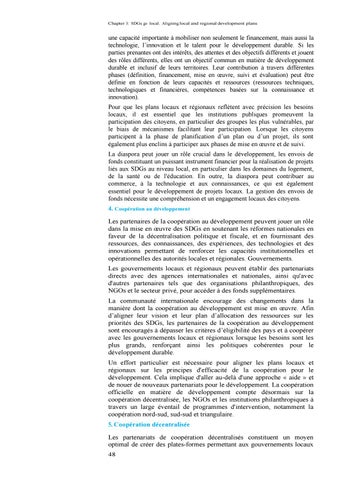 une capacité importante à mobiliser non seulement le financement, mais aussi la technologie, l’innovation et le talent pour le développement durable. Si les parties prenantes ont des intérêts, des attentes et des objectifs différents et jouent des rôles différents, elles ont un objectif commun en matière de développement durable et inclusif de leurs territoires. Leur contribution à travers différentes phases (définition, financement, mise en œuvre, suivi et évaluation) peut être définie en fonction de leurs capacités et ressources (ressources techniques, technologiques et financières, compétences basées sur la connaissance et innovation). Pour que les plans locaux et régionaux reflètent avec précision les besoins locaux, il est essentiel que les institutions publiques promeuvent la participation des citoyens, en particulier des groupes les plus vulnérables, par le biais de mécanismes facilitant leur participation. Lorsque les citoyens participent à la phase de planification d’un plan ou d’un projet, ils sont également plus enclins à participer aux phases de mise en œuvre et de suivi. La diaspora peut jouer un rôle crucial dans le développement, les envois de fonds constituant un puissant instrument financier pour la réalisation de projets liés aux SDGs au niveau local, en particulier dans les domaines du logement, de la santé ou de l'éducation. En outre, la diaspora peut contribuer au commerce, à la technologie et aux connaissances, ce qui est également essentiel pour le développement de projets locaux. La gestion des envois de fonds nécessite une compréhension et un engagement locaux des citoyens. 4. Coopération au développement Les partenaires de la coopération au développement peuvent jouer un rôle dans la mise en œuvre des SDGs en soutenant les réformes nationales en faveur de la décentralisation politique et fiscale, et en fournissant des ressources, des connaissances, des expériences, des technologies et des innovations permettant de renforcer les capacités institutionnelles et opérationnelles des autorités locales et régionales. Gouvernements. Les gouvernements locaux et régionaux peuvent établir des partenariats directs avec des agences internationales et nationales, ainsi qu'avec d'autres partenaires tels que des organisations philanthropiques, des NGOs et le secteur privé, pour accéder à des fonds supplémentaires. La communauté internationale encourage des changements dans la manière dont la coopération au développement est mise en œuvre. Afin d’aligner leur vision et leur plan d’allocation des ressources sur les priorités des SDGs, les partenaires de la coopération au développement sont encouragés à dépasser les critères d’éligibilité des pays et à coopérer avec les gouvernements locaux et régionaux lorsque les besoins sont les plus grands, renforçant ainsi les politiques cohérentes pour le développement durable. Un effort particulier est nécessaire pour aligner les plans locaux et régionaux sur les principes d'efficacité de la coopération pour le développement. Cela implique d'aller au-delà d'une approche « aide » et de nouer de nouveaux partenariats pour le développement. La coopération officielle en matière de développement compte désormais sur la coopération décentralisée, les NGOs et les institutions philanthropiques à travers un large éventail de programmes d'intervention, notamment la coopération nord-sud, sud-sud et triangulaire. 5. Coopération décentralisée Les partenariats de coopération décentralisés constituent un moyen optimal de créer des plates-formes permettant aux gouvernements locaux 48
