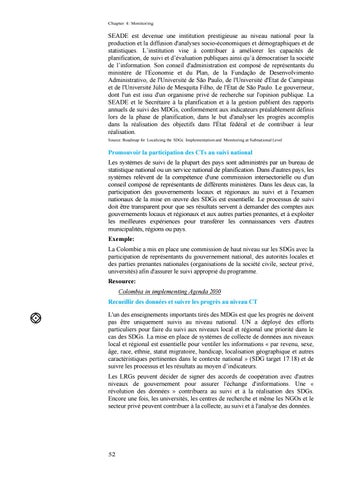 Promouvoir la participation des CTs au suivi national Les systèmes de suivi de la plupart des pays sont administrés par un bureau de statistique national ou un service national de planification. Dans d'autres pays, les systèmes relèvent de la compétence d'une commission intersectorielle ou d'un conseil composé de représentants de différents ministères. Dans les deux cas, la participation des gouvernements locaux et régionaux au suivi et à l'examen nationaux de la mise en œuvre des SDGs est essentielle. Le processus de suivi doit être transparent pour que ses résultats servent à demander des comptes aux gouvernements locaux et régionaux et aux autres parties prenantes, et à exploiter les meilleures expériences pour transférer les connaissances vers d'autres municipalités, régions ou pays. Exemple: La Colombie a mis en place une commission de haut niveau sur les SDGs avec la participation de représentants du gouvernement national, des autorités locales et des parties prenantes nationales (organisations de la société civile, secteur privé, universités) afin d'assurer le suivi approprié du programme. Resource: Colombia in implementing Agenda 2030 Recueillir des données et suivre les progrès au niveau CT L'un des enseignements importants tirés des MDGs est que les progrès ne doivent pas être uniquement suivis au niveau national. UN a déployé des efforts particuliers pour faire du suivi aux niveaux local et régional une priorité dans le cas des SDGs. La mise en place de systèmes de collecte de données aux niveaux local et régional est essentielle pour ventiler les informations « par revenu, sexe, âge, race, ethnie, statut migratoire, handicap, localisation géographique et autres caractéristiques pertinentes dans le contexte national » (SDG target 17.18) et de suivre les processus et les résultats au moyen d’indicateurs. Les LRGs peuvent décider de signer des accords de coopération avec d'autres niveaux de gouvernement pour assurer l'échange d'informations. Une « révolution des données » contribuera au suivi et à la réalisation des SDGs. Encore une fois, les universités, les centres de recherche et même les NGOs et le secteur privé peuvent contribuer à la collecte, au suivi et à l'analyse des données.