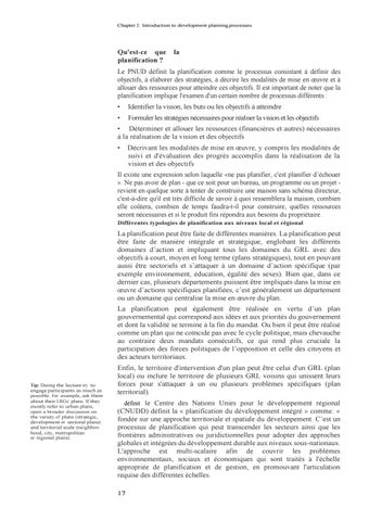 Le PNUD définit la planification comme le processus consistant à définir des objectifs, à élaborer des stratégies, à décrire les modalités de mise en œuvre et à allouer des ressources pour atteindre ces objectifs. Il est important de noter que la planification implique l'examen d'un certain nombre de processus différents : •