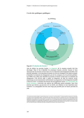 Étape clé 1: Évaluation des besoins 1 Afin de définir les priorités locales, un diagnostic de la situation actuelle doit être développé. Dans le but d’identifier les principaux besoins, priorités, lacunes et liens intersectoriels du territoire et leurs liens avec les objectifs de développement durable et les priorités nationales, il est nécessaire de passer en revue les stratégies et les plans existants, d’identifier les domaines de changement, puis de les comparer avec les priorités globales. Les ODD et les cibles pour identifier les lacunes et fournir la base pour ces domaines de changement. Cela devrait aider à établir un diagnostic de base du contexte social, économique et environnemental conformément au programme de développement durable à l'horizon 2030. L'évaluation des besoins devrait également inclure une cartographie des parties prenantes, c'est-à-dire une analyse des différentes parties prenantes, aussi bien externes que internes, qui peuvent avoir un intérêt, une influence ou une importance pour l'initiative. La cartographie doit être aussi large que possible pour ne laisser personne de côté.