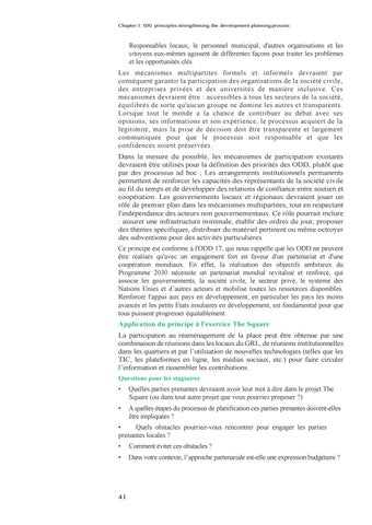 Responsables locaux, le personnel municipal, d'autres organisations et les citoyens eux-mêmes agissent de différentes façons pour traiter les problèmes et les opportunités clés. Les mécanismes multipartites formels et informels devraient par conséquent garantir la participation des organisations de la société civile, des entreprises privées et des universités de manière inclusive. Ces mécanismes devraient être : accessibles à tous les secteurs de la société, équilibrés de sorte qu'aucun groupe ne domine les autres et transparents. Lorsque tout le monde a la chance de contribuer au débat avec ses opinions, ses informations et son expérience, le processus acquiert de la légitimité, mais la prise de décision doit être transparente et largement communiquée pour que le processus soit responsable et que les confidences soient préservées. Dans la mesure du possible, les mécanismes de participation existants devraient être utilisés pour la définition des priorités des ODD, plutôt que par des processus ad hoc ; Les arrangements institutionnels permanents permettent de renforcer les capacités des représentants de la société civile au fil du temps et de développer des relations de confiance entre soutien et coopération. Les gouvernements locaux et régionaux devraient jouer un rôle de premier plan dans les mécanismes multipartites, tout en respectant l'indépendance des acteurs non gouvernementaux. Ce rôle pourrait inclure : assurer une infrastructure minimale, établir des ordres du jour, proposer des thèmes spécifiques, distribuer du matériel pertinent ou même octroyer des subventions pour des activités particulières. Ce principe est conforme à l'ODD 17, qui nous rappelle que les ODD ne peuvent être réalisés qu'avec un engagement fort en faveur d'un partenariat et d'une coopération mondiaux. En effet, la réalisation des objectifs ambitieux du Programme 2030 nécessite un partenariat mondial revitalisé et renforcé, qui associe les gouvernements, la société civile, le secteur privé, le système des Nations Unies et d’autres acteurs et mobilise toutes les ressources disponibles. Renforcer l'appui aux pays en développement, en particulier les pays les moins avancés et les petits États insulaires en développement, est fondamental pour que tous puissent progresser équitablement. Application du principe à l'exercice The Square La participation au réaménagement de la place peut être obtenue par une combinaison de réunions dans les locaux du GRL, de réunions institutionnelles dans les quartiers et par l’utilisation de nouvelles technologies (telles que les TIC, les plateformes en ligne, les médias sociaux, etc.) pour faire circuler l’information et rassembler les contributions. Questions pour les stagiaires