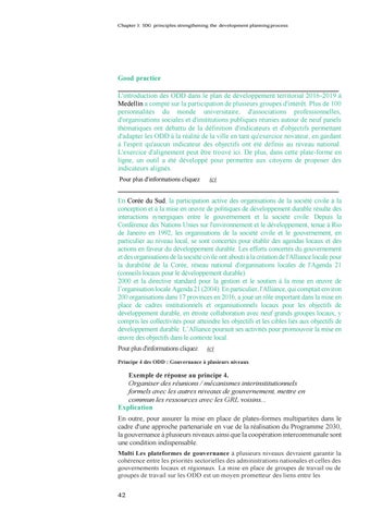Exemple de réponse au principe 4. Organiser des réunions / mécanismes interinstitutionnels formels avec les autres niveaux de gouvernement, mettre en commun les ressources avec les GRL voisins... Explication En outre, pour assurer la mise en place de plates-formes multipartites dans le cadre d'une approche partenariale en vue de la réalisation du Programme 2030, la gouvernance à plusieurs niveaux ainsi que la coopération intercommunale sont une condition indispensable. Multi Les plateformes de gouvernance à plusieurs niveaux devraient garantir la cohérence entre les priorités sectorielles des administrations nationales et celles des gouvernements locaux et régionaux. La mise en place de groupes de travail ou de groupes de travail sur les ODD est un moyen prometteur des liens entre les 42