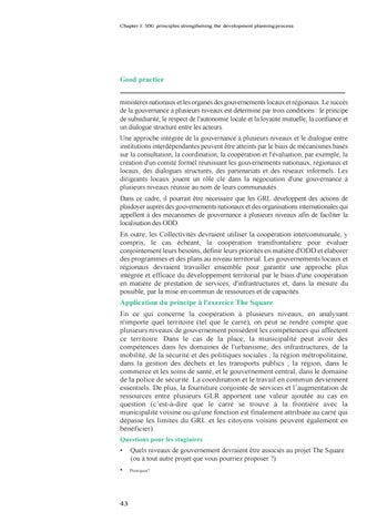 Good practice ministères nationaux et les organes des gouvernements locaux et régionaux. Le succès de la gouvernance à plusieurs niveaux est déterminé par trois conditions : le principe de subsidiarité, le respect de l'autonomie locale et la loyauté mutuelle, la confiance et un dialogue structuré entre les acteurs. Une approche intégrée de la gouvernance à plusieurs niveaux et le dialogue entre institutions interdépendantes peuvent être atteints par le biais de mécanismes basés sur la consultation, la coordination, la coopération et l'évaluation, par exemple, la création d'un comité formel réunissant les gouvernements nationaux, régionaux et locaux, des dialogues structurés, des partenariats et des réseaux informels. Les dirigeants locaux jouent un rôle clé dans la négociation d'une gouvernance à plusieurs niveaux réussie au nom de leurs communautés. Dans ce cadre, il pourrait être nécessaire que les GRL développent des actions de plaidoyer auprès des gouvernements nationaux et des organisations internationales qui appellent à des mécanismes de gouvernance à plusieurs niveaux afin de faciliter la localisation des ODD. En outre, les Collectivités devraient utiliser la coopération intercommunale, y compris, le cas échéant, la coopération transfrontalière pour évaluer conjointement leurs besoins, définir leurs priorités en matière d'ODD et élaborer des programmes et des plans au niveau territorial. Les gouvernements locaux et régionaux devraient travailler ensemble pour garantir une approche plus intégrée et efficace du développement territorial par le biais d'une coopération en matière de prestation de services, d'infrastructures et, dans la mesure du possible, par la mise en commun de ressources et de capacités. Application du principe à l'exercice The Square En ce qui concerne la coopération à plusieurs niveaux, en analysant n'importe quel territoire (tel que le carré), on peut se rendre compte que plusieurs niveaux de gouvernement possèdent les compétences qui affectent ce territoire. Dans le cas de la place, la municipalité peut avoir des compétences dans les domaines de l'urbanisme, des infrastructures, de la mobilité, de la sécurité et des politiques sociales ; la région métropolitaine, dans la gestion des déchets et les transports publics ; la région, dans le commerce et les soins de santé, et le gouvernement central, dans le domaine de la police de sécurité. La coordination et le travail en commun deviennent essentiels. De plus, la fourniture conjointe de services et l’augmentation de ressources entre plusieurs GLR apportent une valeur ajoutée au cas en question (c’est-à-dire que le carré se trouve à la frontière avec la municipalité voisine ou qu'une fonction est finalement attribuée au carré qui dépasse les limites du GRL et les citoyens voisins peuvent également en bénéficier). Questions pour les stagiaires