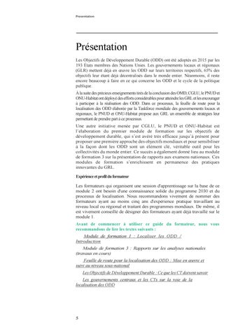 Présentation Les Objectifs de Développement Durable (ODD) ont été adoptés en 2015 par les 193 États membres des Nations Unies. Les gouvernements locaux et régionaux (GLR) mettent déjà en œuvre les ODD sur leurs territoires respectifs, 65% des objectifs leur étant déjà décentralisés dans le monde entier. Néanmoins, il reste encore beaucoup à faire en ce qui concerne les ODD et le cycle de la politique publique. À la suite des précieux enseignements tirés de la conclusion des OMD, CGLU, le PNUD et ONU-Habitat ont déployé des efforts considérables pour atteindre les GRL et les encourager à participer à la réalisation des ODD. Dans ce processus, la feuille de route pour la localisation des ODD élaborée par la Taskforce mondiale des gouvernements locaux et régionaux, le PNUD et ONU-Habitat propose aux GRL un ensemble de stratégies leur permettant de prendre part à ce processus. Une autre initiative menée par CGLU, le PNUD et ONU-Habitat est l’élaboration du premier module de formation sur les objectifs de développement durable, qui s’est avéré très efficace jusqu’à présent pour proposer une première approche des objectifs mondiaux et pour sensibiliser à la façon dont les ODD sont un élément clé, véritable outil pour les collectivités du monde entier. Ce succès a également donné lieu au module de formation 3 sur la présentation de rapports aux examens nationaux. Ces modules de formation s’enrichissent en permanence des pratiques innovantes du GRL. Expérience et profil du formateur Les formateurs qui organisent une session d'apprentissage sur la base de ce module 2 ont besoin d'une connaissance solide du programme 2030 et du processus de localisation. Nous recommandons vivement de nommer des formateurs ayant au moins cinq ans d'expérience pratique travaillant au niveau local ou régional et traitant des programmes mondiaux. De même, il est vivement conseillé de désigner des formateurs ayant déjà travaillé sur le module 1. Avant de commencer à utiliser ce guide du formateur, nous vous recommandons de lire les textes suivants : Module de formation 1 : Localiser les ODD / Introduction Module de formation 3 : Rapports sur les analyses nationales (travaux en cours) Feuille de route pour la localisation des ODD : Mise en œuvre et suivi au niveau sous-national Les Objectifs de Développement Durable : Ce que les CT doivent savoir Les gouvernements centraux et les CTs sur la voie de la localisation des ODD
