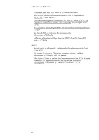 Edinburgh open data Map, The City of Edinburgh Council Prácticas de gobierno abierto y transparencia para el cumplimiento de los ODS, UNDP México Sustainable Development Goals Report on Cities — Launch of SDG City Reports on Shimokawa, Toyama, and Kitakyushu, Localizing the SDGs Portal Good practices. Integrating the SDGs into development planning. Indonesia, UNDP La Agenda 2030 en Colombia. Los departamentos, Government of Colombia Achieving a Sustainable Urban America: SDSN’s first U.S. Cities SDG Index, UNSDSN Autres Localizing the gender equality goal through urban planning tools in South Asia, STEP Territorial Development Plans as an instrument of peace building, Government of Colombia, GiZ (in Spanish) The Region of Valencia and the local implementation of the SDGs: A region committed to Cooperation and the 2030 Agenda for Sustainable Development, Government of Comunitat Valenciana, UNDP