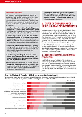 Principales conclusions Vous trouverez ci-dessous une synthèse des résultats du questionnaire et de l’analyse des ressources en ligne, structurés selon les défis de gouvernance de l’urgence, les innovations et les lacunes dans les connaissances. Les définitions de tous les termes et de toutes les catégories sont précisées en annexe de cette note. Les principales conclusions sont les suivantes : • Les villes et les régions ont identifié plus fréquemment des défis liés à l’administration, à la gestion technique et à l’innovation que des défis liés aux domaines politiques de la démocratie, de la légitimation et de l’inclusion.