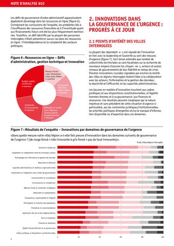 2. INNOVATIONS DANS LA GOUVERNANCE DE L’URGENCE : PROGRÈS À CE JOUR 2.1 POINTS D’INTÉRÊT DES VILLES INTERROGÉES La plupart des répondant·e·s ont signalé de l’innovation en lien avec le leadership et l’autorité au sein des mesures d’urgence (figure 7). Ceci laisse entendre que nombre de collectivités territoriales se sont focalisées sur la recherche de nouveaux moyens d’assurer les citoyen·ne·s, acteurs et autres niveaux de gouvernement de leur fiabilité en temps de crise. D’autres innovations cruciales signalées par environ la moitié des villes et régions interrogées étaient liées à la collaboration avec les acteurs; l’information et la gestion des données; la réactivité et l’efficacité; et les capacités administratives. Les lacunes en matière d’innovation touchent aux cadres juridiques et aux dispositions constitutionnelles; à l’égalité hommes-femmes et à sa gouvernance; aux finances et ressources. Ces résultats peuvent s’expliquer par la nature imprévue et sans précédent de cette situation d’urgence si particulière, par les contraintes juridiques/institutionnelles, les priorités politiques divergentes et/ou le manque d’information disponible ou d’expertise dans ces domaines.