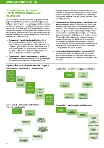 4.3. COMPOSANTES CLÉS POUR LES PROCESSUS DE GOUVERNANCE DE L’URGENCE Tout en reconnaissant les mêmes mises en garde concernant la généralisabilité et les limitations des modèles génériques, la figure 6 identifie quatre composantes potentielles au sein des processus de gouvernance pour aborder les urgences complexes dans le cadre de la phase post-déni. Ces composantes sont initialement considérées de façon séquentielle, mais elles devront peut-être être intégrées au sein d’un processus itératif pour les urgences complexes plus longues, en particulier dans le cas de la réponse à la crise climatique. 1. Composante 1 : la stabilisation de l’incident direct suit un processus itératif, depuis l’établissement de la base d’informations pour l’intervention et un « narratif de l’urgence », jusqu’à la mise en œuvre des réponses, tout en étant simultanément en communication constante avec le public. La stabilisation dans le cadre d’urgences complexes peut s’étendre sur une longue période. 2. Composante 2 : aborder les conséquences indirectes permet de prioriser et d’ordonner les actions qui se chargent des effets collatéraux émanant de la réponse initiale à
