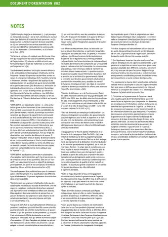 2 Le terme de « crise » est employé pour décrire une situation qui « (1) menace les valeurs hautement prioritaires de l’organisation, (2) présente un délai restreint pour formuler la réponse et (3) est inattendue ou non prévue par l’organisation » [4]. 3 Les événements extrêmes font le plus souvent référence à des phénomènes météorologiques inhabituels, dont la fréquence n’a cessé d’augmenter ces dernières années en raison du changement climatique [57]. Toutefois, le terme « événement extrême » a également été appliqué à des événements non liés au climat tels que le terrorisme [58] et les pannes de courant [59] Brosaka et al. définissent un événement extrême comme « un événement dynamique ayant lieu dans un laps de temps limité, qui entrave le fonctionnement d’un ou des systèmes ». Leur définition des événements extrêmes tient donc compte à la fois de l’incident ou de l’élément déclencheur initial et ses impacts [60]. 4 L’OMS définit une catastrophe comme : 1. « Une perturbation grave du fonctionnement d’une communauté ou d’une société, occasionnant des pertes considérables du point de vue humain, matériel, économique ou environnemental, qui dépassent la capacité de la communauté ou de la société affectée à y faire face en ayant recours à ses propres ressources (SIPC). 2. Une situation ou un événement qui dépasse les capacités locales pour y faire face rendant nécessaire le recours à l’aide externe, que ce soit au niveau national ou international (CRED). 3. Un terme décrivant un événement qui peut être défini du point de vue spatial et géographique, mais qui exige des observations pour produire des éléments de preuve. Il implique l’interaction entre un facteur de tension externe et une communauté humaine et il inclut implicitement la notion de non-manœuvrabilité. Le terme est utilisé pour un éventail complet d’activités de réduction des risques, mais il est vraisemblablement le moins adéquat pour la “réponse” » [2]. 5 L’OMS définit les désastres comme des « catastrophes d’une ampleur particulière (bien qu’il n’y ait pas encore eu de tentative connue de les quantifier). Elles ont un “narratif”, une valeur descriptive et un objectif de plaidoyer, principalement. Du point de vue conceptuel, le terme est davantage lié aux activités de reconstruction » [2]. 6 Les seuils peuvent être problématiques pour la communication interdisciplinaire et la classification des différents types d’événements. Ils peuvent également être arbitraires dans certains cas [60]. 7 Contrairement aux urgences inhabituelles telles que les catastrophes naturelles ou les actes de terrorisme, chez les urgences complexes, nombre des déclencheurs amenant une réponse humaine immédiate et réflexe sont absents. Elles requièrent donc une évolution de perspective, en passant de réponse aux urgences ex-post (réponse à une catastrophe existante) à ex-ante (réponse anticipée à une catastrophe) [57]. 8 Les grands défis font le plus habituellement référence aux problèmes complexes ayant été identifiés comme priorités pour la recherche, les activités humanitaires ou le gouvernement. Il y a des questions ou des problèmes (1) auxquels il est extrêmement difficile de répondre ou qui sont compliqués à résoudre, mais qui offrent néanmoins l’espoir d’une solution ; (2) dont l’ampleur est globale, ou qui ont des répercussions sur des millions de personnes ; (3) qui exigent un travail entre disciplines et sous-disciplines ;