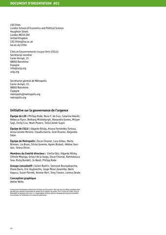 Initiative sur la gouvernance de l’urgence Équipe de LSE : Philipp Rode, Nuno F. da Cruz, Catarina Heeckt, Rebecca Flynn, Bethany Mickleburgh, Alexandra Gomes, Mirjam Sagi, Emily Cruz, Noah Powers, Talia Calnek-Sugin Équipe de CGLU : Edgardo Bilsky, Ainara Fernández Tortosa, Anna Calvete Moreno, Claudia García, José Álvarez, Alejandra Salas Équipe de Metropolis : Oscar Chamat, Luca Arbau, Marta Briones, Lia Brum, Silvia Llorente, Agnès Bickart, Hélène Jourdan, Teresa Oliver. Membres du Comité directeur : Emilia Sáiz, Edgardo Bilsky, Sithole Mbanga, Octavi de la Varga, Oscar Chamat, Rahmatouca Sow, Ricky Burdett, Jo Beall, Philipp Rode Groupe consultatif : Julien Baskin, Somsook Boonyabancha, Diane Davis, Eric Huybrechts, Jorge Pérez-Jaramillo, Naim Kapucu, Susan Parnell, Aromar Revi, Tony Travers, Lorena Zárate Conception graphique Atelier Works Ce document d’orientation entend servir de base aux discussions. Bien que tous les efforts possibles aient été faits pour garantir l’exactitude du contenu de ce rapport, les auteur·rice·s et/ou LSE Cities, CGLU et Metropolis ne sauraient être tenu·e·s responsables de toute perte ou dommage qui pourrait éventuellement résulter de l’utilisation de la présente publication.