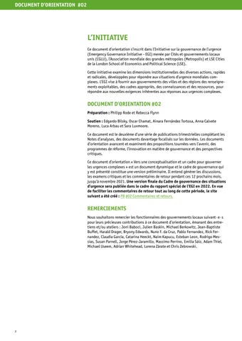 DOCUMENT D’ORIENTATION #02 Préparation : Philipp Rode et Rebecca Flynn Soutien : Edgardo Bilsky, Oscar Chamat, Ainara Fernández Tortosa, Anna Calvete Moreno, Luca Arbau et Sara Luxmoore. Ce document est le deuxième d’une série de publications trimestrielles complétant les Notes d’analyses, des documents davantage focalisés sur les données. Les documents d’orientation avancent et examinent des propositions tournées vers l’avenir, des programmes de réforme, l’innovation en matière de gouvernance et des perspectives critiques. Ce document d’orientation « Vers une conceptualisation et un cadre pour gouverner les urgences complexes » est un document dynamique et le cadre de gouvernance qui y est présenté constitue une version préliminaire. Il entend générer les discussions, les examens critiques et les commentaires de retour pendant ces 12 prochains mois, jusqu’à novembre 2021. Une version finale du Cadre de gouvernance des situations d’urgence sera publiée dans le cadre du rapport spécial de l’EGI en 2022. En vue de faciliter les commentaires de retour tout au long de cette période, le site suivant a été créé : PB #02 Commentaires et retours.
