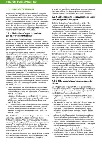 3.2.3. Défis rencontrés par les gouvernements locaux Les défis particulier auxquels font face les gouvernements locaux dans leurs réponses à l’urgence climatique ont été clairement documentés par le travail de Darebin, la première ville du monde à déclarer l’urgence climatique [28] : − l’ampleur et la rapidité requises ne correspondent pas au rythme auquel évoluent habituellement les administrations gouvernementales ; − aller « au-delà du statu quo », alors que cela n’est pas encore reflété dans la société ou à l’échelle fédérale ou d’état ; − ne pas avoir de contrôle sur tous les leviers et mécanismes nécessaires à la mise en œuvre des changements requis, et le besoin d’un changement politique à l’échelle fédérale ou d’état ; − redonner la priorité aux budgets et ressources pour aborder l’urgence climatique, tout en devant encore fournir les services essentiels et maintenir le soutien de la communauté ; − obtenir l’appui et la compréhension de la communauté vers un programme massif de prévention avant que la catastrophe climatique ne soit pleinement ressentie ; − intégrer la réponse au sein de toute l’administration, ce qui demandera du temps, de la formation et des ressources ; − travailler en territoire inconnu où il n’existe pas encore de plan défini sur la façon de mener une réponse efficace face à l’urgence climatique.