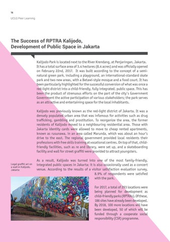 The Success of RPTRA Kalijodo, Development of Public Space in Jakarta Kalijodo Park is located next to the River Krendang, at Penjaringan, Jakarta. It has a total surface area of 3.4 hectares (8.4 acres) and was officially opened on February 22nd, 2017. It was built according to the concept of a seminatural green park, including a playground, an international-standard skate park and two new areas, with a Betawi-style mosque and a food court. It has been particularly highlighted for the successful conversion of what was once a red-light district into a child-friendly, fully integrated, public space. This has been the product of strenuous efforts on the part of the city's Government Government the active participation of various stakeholders; the park serves as an attractive and entertaining space for the local inhabitants. Kalijodo was previously known as the red-light district of Jakarta. It was a densely populated urban area that was infamous for activities such as drug trafficking, gambling and prostitution. To reorganize the area, the former residents of Kalijodo moved to a neighbouring residential area. Those with Jakarta identity cards were allowed to move to cheap rented apartments, known as rusunawa, in an area called Marunda, which was about an hour’s drive to the east. The regional government provided local residents their professions with free skills training at vocational centres. On top of that, childfriendly facilities, such as re and library, were set up, and a skateboarding facility and wall for street graffiti were provided to attract youngsters. Legal graffiti art on a wall in Kalijodo, Jakarta