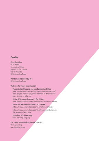 Credits Coordination UCLG ASPAC Connective Cities Agenda 21 for Culture City of Jakarta UCLG Learning Team Written and Edited by the UCLG Learning Team Website for more information Presentation files and photos: Connective Cities www.connective-cities.net/en/events/documentations/ local-project-workshops/urban-renewal-in-the-historictown-centre-of-jakarta/ Cultural Strategy: Agenda 21 for Culture www.agenda21culture.net/documents/culture-21-actions Event and Recommendations: UCLG ASPAC https://issuu.com/uclg-aspac/docs/urban_renewal https://issuu.com/uclg-aspac/docs/recommendation_for the renewal of kota_tua Learning: UCLG Learning www.learning.uclg.org For more information please contact: UCLG Learning learning@uclg.org