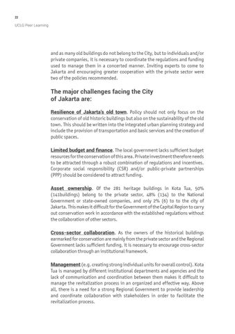 The major challenges facing the City of Jakarta are: Resilience of Jakarta’s old town. Policy should not only focus on the conservation of old historic buildings but also on the sustainability of the old town. This should be written into the integrated urban planning strategy and include the provision of transportation and basic services and the creation of public spaces. Limited budget and finance. The local government lacks sufficient budget resources for the conservation of this area. Private investment therefore needs to be attracted through a robust combination of regulations and incentives. Corporate social responsibility (CSR) and/or public-private partnerships (PPP) should be considered to attract funding. Asset ownership. Of the 281 heritage buildings in Kota Tua, 50% (141buildings) belong to the private sector, 48% (134) to the National Government or state-owned companies, and only 2% (6) to to the city of Jakarta. This makes it difficult for the Government of the Capital Region to carry out conservation work in accordance with the established regulations without the collaboration of other sectors. Cross-sector collaboration. As the owners of the historical buildings earmarked for conservation are mainly from the private sector and the Regional Government lacks sufficient funding, it is necessary to encourage cross-sector collaboration through an institutional framework. Management (e.g. creating strong individual units for overall control). Kota Tua is managed by different institutional departments and agencies and the lack of communication and coordination between them makes it difficult to manage the revitalization process in an organized and effective way. Above all, there is a need for a strong Regional Government to provide leadership and coordinate collaboration with stakeholders in order to facilitate the revitalization process.