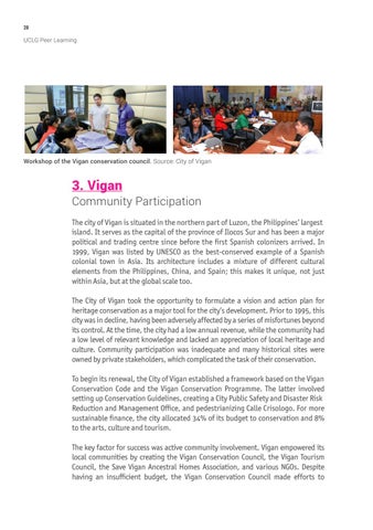 Community Participation The city of Vigan is situated in the northern part of Luzon, the Philippines’ largest island. It serves as the capital of the province of Ilocos Sur and has been a major political and trading centre since before the first Spanish colonizers arrived. In 1999, Vigan was listed by UNESCO as the best-conserved example of a Spanish colonial town in Asia. Its architecture includes a mixture of different cultural elements from the Philippines, China, and Spain; this makes it unique, not just within Asia, but at the global scale too. The City of Vigan took the opportunity to formulate a vision and action plan for heritage conservation as a major tool for the city’s development. Prior to 1995, this city was in decline, having been adversely affected by a series of misfortunes beyond its control. At the time, the city had a low annual revenue, while the community had a low level of relevant knowledge and lacked an appreciation of local heritage and culture. Community participation was inadequate and many historical sites were owned by private stakeholders, which complicated the task of their conservation. To begin its renewal, the City of Vigan established a framework based on the Vigan Conservation Code and the Vigan Conservation Programme. The latter involved setting up Conservation Guidelines, creating a City Public Safety and Disaster Risk Reduction and Management Office, and pedestrianizing Calle Crisologo. For more sustainable finance, the city allocated 34% of its budget to conservation and 8% to the arts, culture and tourism. The key factor for success was active community involvement. Vigan empowered its local communities by creating the Vigan Conservation Council, the Vigan Tourism Council, the Save Vigan Ancestral Homes Association, and various NGOs. Despite having an insufficient budget, the Vigan Conservation Council made efforts to