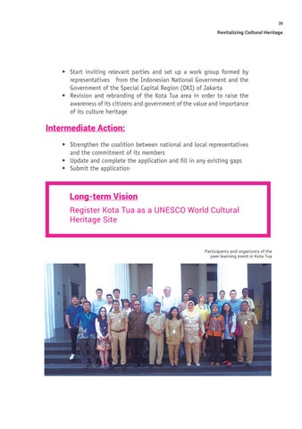 • Start inviting relevant parties and set up a work group formed by representatives from the Indonesian National Government and the Government of the Special Capital Region (DKI) of Jakarta • Revision and rebranding of the Kota Tua area in order to raise the awareness of its citizens and government of the value and importance of its culture heritage