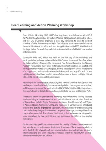 Peer Learning and Action Planning Workshop From 17th to 19th July 2017, UCLG’s learning team, in collaboration with UCLG ASPAC, the UCLG Committee on Culture (Agenda 21 for culture), Connective Cities, and the City of Jakarta, organized a three-day workshop, to listen to the best practices of cities in Germany and Asia. This initiative made recommendations for the rehabilitation of Kota Tua and also its application for UNESCO World Cultural Heritage status. The workshop included various activities: a field visit, case studies and discussions. During the field visit, which was held on the first day of the workshop, the participants had a chance to look at Fatahillah Square, the core of Kota Tua, where the Jakarta History Museum, the Museum of Fine Art and Ceramics, the Wayang Puppetry Museum and many other historically important buildings are located. The participants then visited RPTRA Kalijodo, a newly created public space. This consists of a playground, an international-standard skate park and a graffiti wall. It was highlighted as it had been used to successfully convert a former red light district into a child-friendly, integrated public space. Returning to the conference at Jakarta City Hall, keynote speeches from German and local experts explained the city’s urban renewal policies, the progress made to date, and the current status of the application for UNESCO World Cultural Heritage status. This was followed by detailed introductions to the Kota Tua area and Kalijodo Park. The second day of the peer learning workshop was dedicated to sharing city case studies relating to the conservation and revitalization of historic sites. The cities of Guangzhou, Makati, Bogor, Semarang, Surabaya, Solo (Surakarta) and Vigan, in Asia; and Essen, Nürmberg, Görlitz, and Tübingen, in Germany, were introduced through the ‘gallery of practices’ approach. This methodology entails displaying case studies in a gallery so that observers can get an instant yet thorough idea of the case studies presented. The value of this format is that audiences are intrigued to know more about the cases and it is also easy to compare the different case studies highlighted. On the third day, specific recommendations for the City of Jakarta were presented that were based on various case studies and discussions. These recommendations were divided into physical and non-physical actions and categorized as short, intermediate and long term. They will be reflected within the next RPJMD: the midterm development plan for Jakarta.