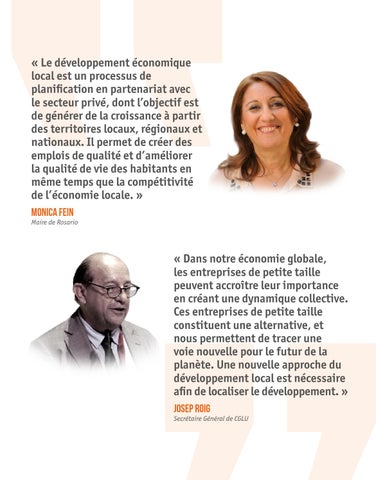 « Le développement économique local est un processus de planification en partenariat avec le secteur privé, dont l’objectif est de générer de la croissance à partir des territoires locaux, régionaux et nationaux. Il permet de créer des emplois de qualité et d’améliorer la qualité de vie des habitants en même temps que la compétitivité de l’économie locale. » MONICA FEIN Maire de Rosario