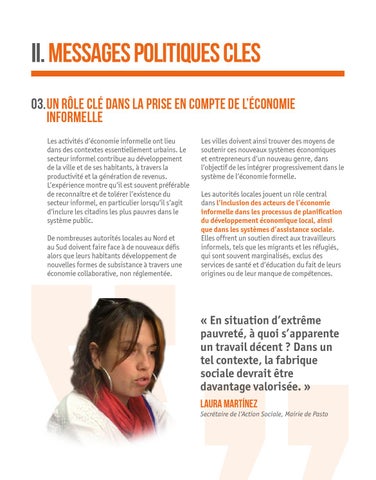 II. MESSAGES POLITIQUES CLES 03. Un rôle clé dans la prise en compte de l’économie informelle Les activités d’économie informelle ont lieu dans des contextes essentiellement urbains. Le secteur informel contribue au développement de la ville et de ses habitants, à travers la productivité et la génération de revenus. L’expérience montre qu’il est souvent préférable de reconnaître et de tolérer l’existence du secteur informel, en particulier lorsqu’il s’agit d’inclure les citadins les plus pauvres dans le système public. De nombreuses autorités locales au Nord et au Sud doivent faire face à de nouveaux défis alors que leurs habitants développement de nouvelles formes de subsistance à travers une économie collaborative, non réglementée.