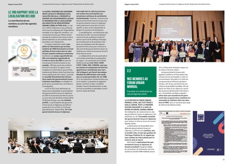 2.2 Nos membres au Forum urbain mondial Travailler à la réalisation du nouvel Agenda urbain LA 9E ÉDITION DU FORUM URBAIN MONDIAL (FUM), QUI S’EST TENUE À KUALA LUMPUR, ÉTAIT LA PREMIÈRE SESSION CONSACRÉE À LA MISE EN ŒUVRE DU NOUVEL AGENDA URBAIN. Une délégation de représentant·e·s des gouvernements locaux et régionaux s’est mobilisée lors de l’Assemblée mondiale des gouvernements locaux et régionaux pour évaluer la mise en œuvre du nouvel Agenda urbain. La Déclaration de l’Assemblée mondiale des gouvernements locaux et régionaux a affirmé notre position, avec la société civile, en tant que gardiens de l’héritage d’Habitat III, et rappelé que nous sommes les mieux placés pour en suivre la mise en œuvre. CGLU était le représentant des gouvernements locaux et régionaux au Conseil consultatif chargé de rédiger les conclusions de l’événement qui sera soumis au Conseil d’ONU-Habitat sous le