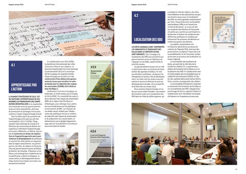 Apprentissage par l’action LE MANDAT STRATÉGIQUE DE CGLU EST DE SOUTENIR L’APPRENTISSAGE DE SES MEMBRES EN PROMOUVANT UNE COOPÉRATION DÉCENTRALISÉE et la coopération internationale entre les gouvernements locaux et leurs associations, ainsi que de promouvoir les échanges entres pairs comme un moyen d’apprentissage mutuel. Dans le même esprit de promotion de l’apprentissage entre pairs au sein des municipalités, CGLU, FLACMA, l’Organisation Internationale du Travail et le Ministère des Autonomies de Bolivie ont organisé un événement d’apprentissage entre pairs à Riberalta, en Bolivie, dans le but de construire un réseau de coopération et d’apprentissage entre pairs pour renforcer le développement de politiques et soutenir les villes petites et moyennes dans la région amazonienne. Les participant·e·s de villes, de régions et d’associations de gouvernements locaux du Brésil, de Bolivie, de Colombie, d’Équateur et du Pérou y ont échangé leurs expériences sur la planification urbaine stratégique, la conservation, le développement économique local et les emplois verts dans une perspective Sud-Sud. 34