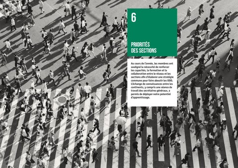 6 Priorités des sections Au cours de l’année, les membres ont souligné la nécessité de renforcer les capacités, la formation et la collaboration entre le réseau et les sections afin d’élaborer une stratégie commune pour faire aboutir les ODD. L’échange de connaissances entre les continents, y compris une séance de travail des secrétaires généraux, a permis de déployer notre potentiel d’apprentissage.
