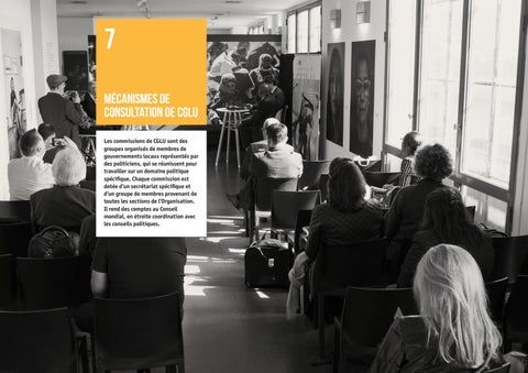 7 Mécanismes de consultation de CGLU Les commissions de CGLU sont des groupes organisés de membres de gouvernements locaux représentés par des politiciens, qui se réunissent pour travailler sur un domaine politique spécifique. Chaque commission est dotée d’un secrétariat spécifique et d’un groupe de membres provenant de toutes les sections de l’Organisation. Il rend des comptes au Conseil mondial, en étroite coordination avec les conseils politiques.
