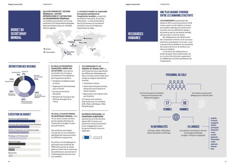 LES CHANGEMENTS organisationnels initiés en 2015 se sont poursuivis en 2018 et des progrès ont été réalisés en termes de nouvelles méthodes de travail et d’interaction entre les différentes équipes de travail au sein du Secrétariat mondial, ainsi que dans le reste du réseau. Des collaborations ont démarré avec des consultantes externes et les nouveaux techniciens d’évaluation et de suivi, ce qui a permis à CGLU d’améliorer son mécanisme de travail et de fournir de meilleurs services aux membres. Le travail de nos collaborateurs a permis de placer CGLU comme acteur clé sur la scène internationale, augmentant la visibilité des activités quotidiennes de l’organisation.