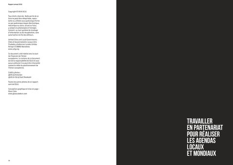 Copyright © 2019 UCLG Tous droits réservés. Nulle partie de ce livre ne peut être réimprimée, reproduite ou utilisée sous quelconque forme ou par quelconque moyen électronique, mécanique ou autre, actuel ou futur, y compris la photocopie et l’enregistrement, ou tout système de stockage d’information ou de récupération, sans autorisation écrite des éditeurs. United Cities and Local Governments Cités et Gouvernements Locaux Unis Ciudades y Gobiernos Locales Unidos Avinyó 15 08002 Barcelona www.uclg.org Ce document a été réalisé avec le soutien financier de l’Union européenne. Le contenu de ce document est de la responsabilité de CGLU et sous aucun prétexte il ne peut être interprété comme le reflet du positionnement de l’Union européenne. Crédits photos : @UCLG/Schardan @UCLG-CGLU/Joel Sheakoski Toutes les autres photos de ce rapport sont de CGLU. Conception graphique et mise en page : Glass Cube www.glasscubebcn.com