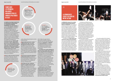 Temps fort les premiers dialogues organisés par les conseils politiques de CGLU LES CONSEILS POLITIQUES CONSTITUENT LES MÉCANISMES DE CONSULTATION ET LE MOTEUR DES PRIORITÉS STRATÉGIQUES 2016-2022 DE CGLU. Ils proposent des initiatives, des idées et des recommandations, ils renforcent le sentiment d’appropriation des politiques et le débat politique au sein de l’Organisation. Ils sont également essentiels pour renouveler la participation d’un groupe plus large de dirigeant·e·s politiques. Les conseils politiques, qui se concentrent sur des thèmes stratégiques, reflètent à la fois les questions clés des agendas mondiaux et les axes prioritaires de l’Engagement de Bogota et se présentent comme suit : Droit à la ville et territoires inclusifs ; Opportunités pour tou·te·s, culture et diplomatie des villes : les clés du développement durable et de la paix ; Gouvernance territoriale multiniveaux et financement durable ; et Villes plus sûres, résilientes, durables et capables de faire face aux crises. Les conseils politiques sont composés d’un maximum de 15 représentant∙e∙s doté∙e∙s d’un mandat politique, dont un membre de la Présidence. Droit à la ville et territoires inclusifs. Co-présidé par Ada Colau, maire de Barcelone et coprésidente de CGLU, et Patrick Braouezec, président de l’aire métropolitaine de Plaine Commune, et coprésident de la Commission inclusion