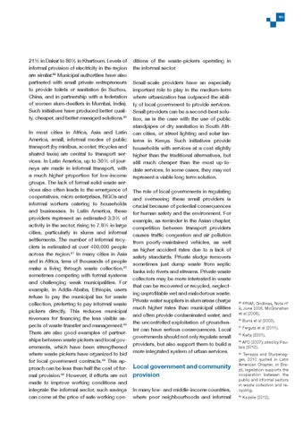 21% in Dakar to 80% in Khartoum. Levels of informal provision of electricity in the region are similar.89 Municipal authorities have also partnered with small private entrepreneurs to provide toilets or sanitation (in Suzhou, China, and in partnership with a federation of women slum-dwellers in Mumbai, India). Such initiatives have produced better quality, cheaper, and better managed solutions.90 In most cities in Africa, Asia and Latin America, small, informal modes of public transport (by minibus, scooter, tricycles and shared taxis) are central to transport services. In Latin America, up to 30% of journeys are made in informal transport, with a much higher proportion for low-income groups. The lack of formal solid waste services also often leads to the emergence of cooperatives, micro enterprises, NGOs and informal workers catering to households and businesses. In Latin America, these providers represent an estimated 3.3% of activity in the sector, rising to 7.8% in large cities, particularly in slums and informal settlements. The number of informal recyclers is estimated at over 400,000 people across the region.91 In many cities in Asia and in Africa, tens of thousands of people make a living through waste collection,92 sometimes competing with formal systems and challenging weak municipalities. For example, in Addis-Ababa, Ethiopia, users refuse to pay the municipal tax for waste collection, preferring to pay informal waste pickers directly. This reduces municipal revenues for financing the less visible aspects of waste transfer and management.93 There are also good examples of partnerships between waste pickers and local governments, which have been strengthened where waste pickers have organized to bid for local government contracts.94 This approach can be less than half the cost of formal provision.95 However, if efforts are not made to improve working conditions and integrate the informal sector, such savings can come at the price of safe working con-