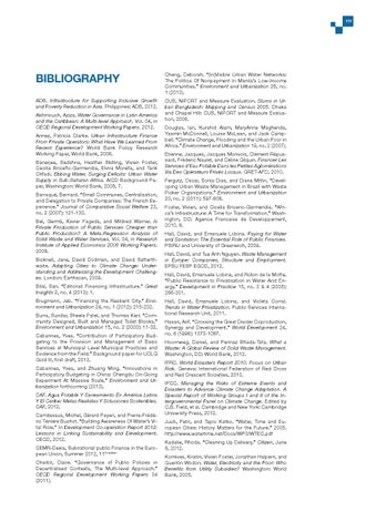 Akhmouch, Aziza. Water Governance in Latin America and the Caribbean: A Multi-level Approach. Vol. 04, in OECD Regional Development Working Papers. 2012. Annez, Patricia Clarke. Urban Infrastructure Finance From Private Operators: What Have We Learned From Recent Experience? World Bank Policy Research Working Paper, World Bank, 2006. Banerjee, Sedshna, Heather Skilling, Vivien Foster, Cecilia Briceño-Garmendia, Elvira Morella, and Tarik Chfadi. Ebbing Water, Surging Deficits: Urban Water Supply in Sub-Saharan Africa. AICD Background Paper, Washington: World Bank, 2008, 7. Barraqué, Bernard. “Small Communes, Centralisation, and Delegation to Private Companies: The French Experience.” Journal of Comparative Social Welfare 23, no. 2 (2007): 121-130. Bel, Germà, Xavier Fageda, and Mildred Warner. Is Private Production of Public Services Cheaper than Public Production? A Meta-Regression Analysis of Solid Waste and Water Services. Vol. 04, in Research Institute of Applied Economics 2008 Working Papers. 2008. Bicknell, Jane, David Dodman, and David Satterthwaite. Adapting Cities to Climate Change: Understanding and Addressing the Development Challenges. London: Earthscan, 2009. Bilal, San. “Editorial: Financing Infrastructure.” Great Insights 2, no. 4 (2013): 1. Brugmann, Jeb. “Financing the Resilient City.” Environment and Urbanization 24, no. 1 (2012): 215-232. Burra, Sundar, Sheela Patel, and Thomas Kerr. “Community Designed, Built and Managed Toilet Blocks.” Environment and Urbanization 15, no. 2 (2003): 11-32. Cabannes, Yves. “Contribution of Participatory Budgeting to the Provision and Management of Basic Services at Municipal Level Municipal Practices and Evidence from the Field.” Background paper for UCLG Gold III, first draft, 2013. Cabannes, Yves, and Zhuang Ming. “Innovations in Participatory Budgeting in China: Chengdu On-Going Experiment At Massive Scale.” Environment and Urbanization forthcoming (2013). CAF. Agua Potable Y Saneamiento En América Latina Y El Caribe: Metas Realistas Y Soluciones Sostenibles. CAF, 2012. Camdessus, Michel, Gérard Payen, and Pierre-Frédéric Ténière Buchot. “Building Awareness Of Water’s Vital Role.” In Development Co-operation Report 2012: Lessons in Linking Sustainability and Development. OECD, 2012. CEMR-Dexia, Subnational public Finance in the European Union, Summer 2012, 11th edition Charbit, Claire. “Governance of Public Policies in Decentralised Contexts, The Multi-level Approach.” OECD Regional Development Working Papers 04 (2011).