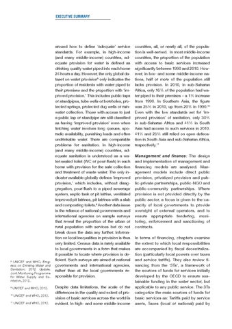 countries, all, or nearly all, of the population is well-served. In most middle-income countries, the proportion of the population with access to basic services increased significantly between 1990 and 2010. However, in low- and some middle-income nations, half or more of the population still lacks provision. In 2010, in sub-Saharan Africa, only 16% of the population had water piped to their premises – a 1% increase from 1990. In Southern Asia, the figure was 25% in 2010, up from 20% in 1990.10 Even with the low standards set for ‘improved provision’ of sanitation, only 30% in sub-Saharan Africa and 41% in South Asia had access to such services in 2010. 41% and 25% still relied on open defecation in South Asia and sub-Saharan Africa, respectively.11 Management and finance: The design and implementation of management and financing models are analysed. Management models include direct public provision, privatized provision and public-private partnerships, public-NGO and public-community partnerships. Where provision is not provided directly by the public sector, a focus is given to the capacity of local governments to provide oversight of external operators, and to ensure appropriate tendering, monitoring, enforcement and sanctioning of contracts. In terms of financing, chapters examine the extent to which local responsibilities are accompanied by fiscal decentralization (particularly local powers over taxes and service tariffs). They also review financing from the ‘3Ts’, a framework of the sources of funds for services initially developed by the OECD to ensure sustainable funding in the water sector, but applicable to any public service. The 3Ts categorize the main sources of funds for basic services as: Tariffs paid by service users, Taxes (local or national) paid by