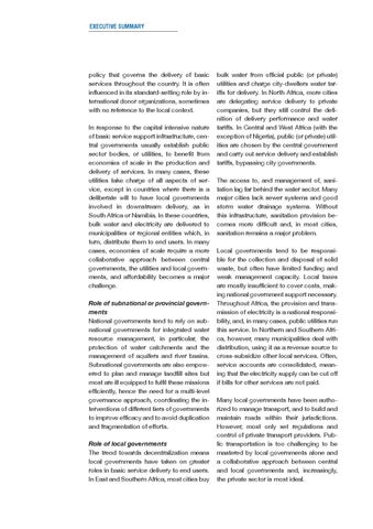 policy that governs the delivery of basic services throughout the country. It is often influenced in its standard-setting role by international donor organizations, sometimes with no reference to the local context. In response to the capital intensive nature of basic service support infrastructure, central governments usually establish public sector bodies, or utilities, to benefit from economies of scale in the production and delivery of services. In many cases, these utilities take charge of all aspects of service, except in countries where there is a deliberate will to have local governments involved in downstream delivery, as in South Africa or Namibia. In these countries, bulk water and electricity are delivered to municipalities or regional entities which, in turn, distribute them to end users. In many cases, economies of scale require a more collaborative approach between central governments, the utilities and local governments, and affordability becomes a major challenge. Role of subnational or provincial governments National governments tend to rely on subnational governments for integrated water resource management, in particular, the protection of water catchments and the management of aquifers and river basins. Subnational governments are also empowered to plan and manage landfill sites but most are ill equipped to fulfil these missions efficiently, hence the need for a multi-level governance approach, coordinating the interventions of different tiers of governments to improve efficacy and to avoid duplication and fragmentation of efforts. Role of local governments The trend towards decentralization means local governments have taken on greater roles in basic service delivery to end users. In East and Southern Africa, most cities buy