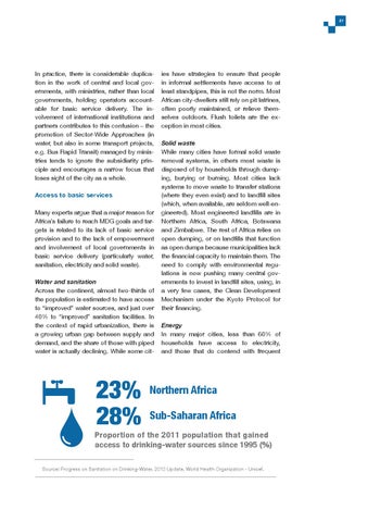 In practice, there is considerable duplication in the work of central and local governments, with ministries, rather than local governments, holding operators accountable for basic service delivery. The involvement of international institutions and partners contributes to this confusion – the promotion of Sector-Wide Approaches (in water, but also in some transport projects, e.g. Bus Rapid Transit) managed by ministries tends to ignore the subsidiarity principle and encourages a narrow focus that loses sight of the city as a whole. Access to basic services Many experts argue that a major reason for Africa’s failure to reach MDG goals and targets is related to its lack of basic service provision and to the lack of empowerment and involvement of local governments in basic service delivery (particularly water, sanitation, electricity and solid waste). Water and sanitation Across the continent, almost two-thirds of the population is estimated to have access to “improved” water sources, and just over 40% to “improved” sanitation facilities. In the context of rapid urbanization, there is a growing urban gap between supply and demand, and the share of those with piped water is actually declining. While some cit-